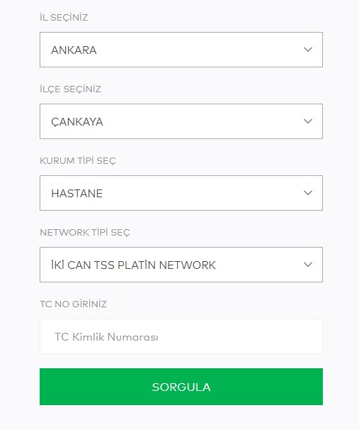 Bulunduğunuz ilde, doğum yapmak istediğiniz hastaneyi kolaylıkla bulmak ve diğer hastaneleri incelemek için; “HASTANE BUL” butonuna tıkladıktan sonra, görselde olduğu gibi sırasıyla… Bulunduğunuz il ve ilçeyi seçmelisiniz. Kurum tipi “HASTANE” olmalıdır. Network tipi İKİ CAN TSS PLATİN NETWORK seçilmelidir. Tc kimlik numarası girmeden sorgulama yapmanız yeterli olacaktır.